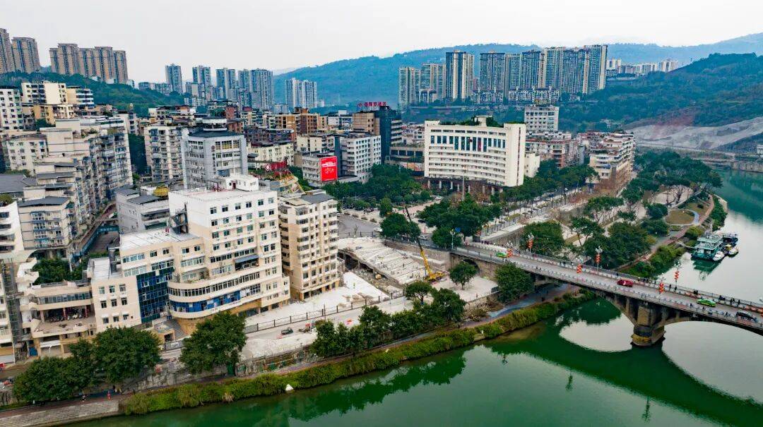 目前立面改造工程已完成,环境施工进度过半,项目总工程量已完成约60%。近期即将开放的区域包括街心公园、亲水步道、休闲广场及由原停车场改建的绿地景观。这些空间注重功能性,增设休闲座椅、景观绿化,并融入綦江本土水文化元素,旨在为市民提供宜人的休闲交往场所。